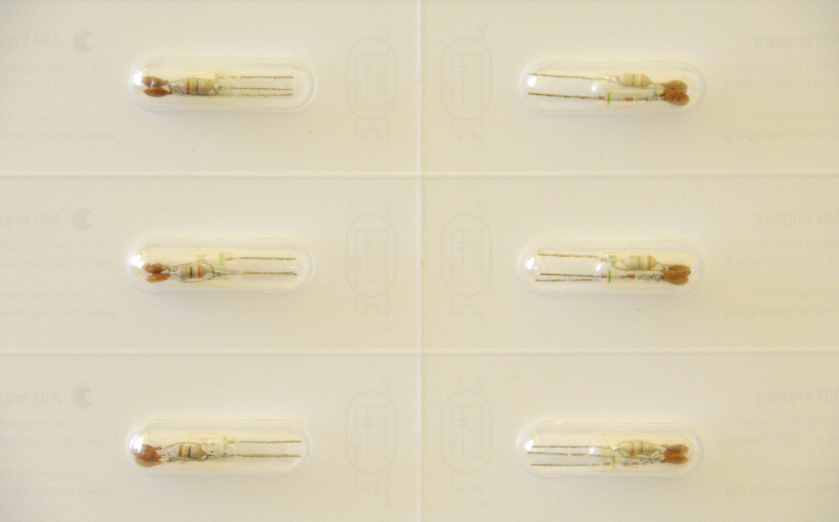 AIR implant is a miniature radio receiver tuned to 912.5 kHz (AM BBC Radio 5) placed in a transparent gelatine capsule. Ten of those are embedded in one AIR implant blister.