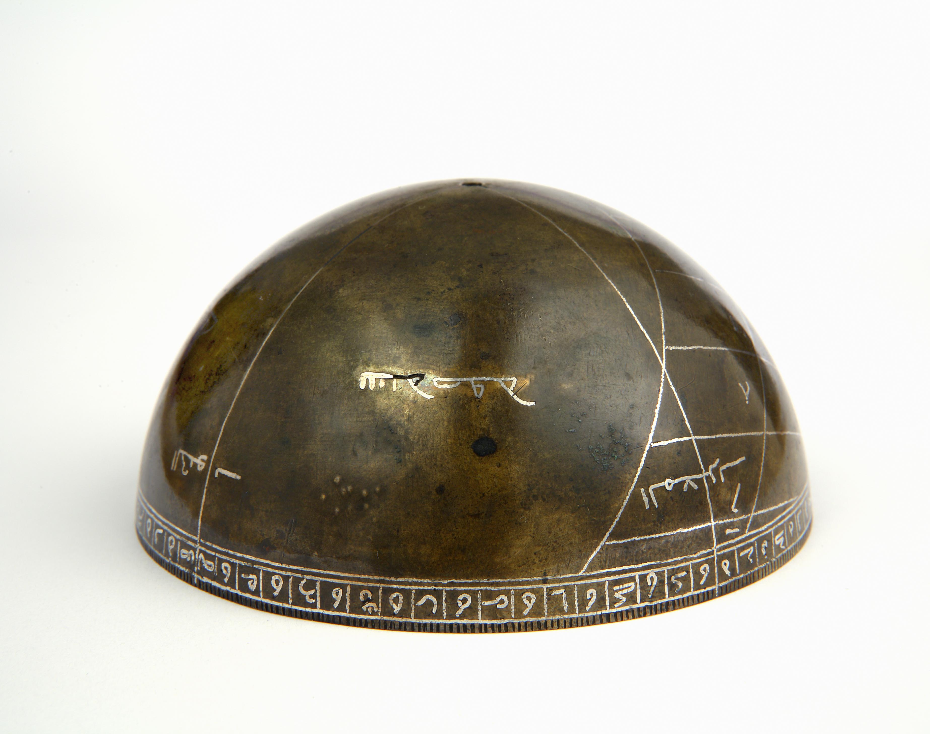 One hemisphere of the globe from the Museum's unique spherical astrolabe. Silver wire has been inlaid into the brass surface of the globe to create lines and legible text. A small portion of the silver has fallen out of the central inscription to reveal the groove into which the silver was hammered.