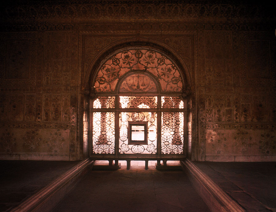The scales of justice above a perforated screen in the Red Fort, Delhi. The Red Fort was the palace for Shah Jahan's new capital, Shahjahanabad, and was begun in 1639.