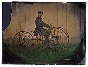 68. Hand-tinted ambrotype of Henry Hill Hodgson on a velocipede, c. 1856