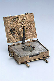 ![]() Astronomical Compendium The outer face of the top cover carries a geographical astrolabe. A rotating circular plate (diameter 44 mm) carries a longitude scale of degrees 0 to 360 at its outer edge, divided to 10 and 2, and numbered by 10. Within the scale is a polar projection of the earth to the Tropic of Capricorn, with the tropics and the equinoctial named. The continents are named but schematically shaped, and there is no major North American land mass. The oceans are not named. The line of zero longitude begins not to the west of Africa as in other Schissler geographical astrolabes (Epact 57238) but lies within the western portion of Africa; it is numbered with a latitude scale at 10? intervals. The plate rotates over a scale of hours I to XII, I to XII, each hour divided to 1/4. In each corner of the cover is a wind-blowing cherub head. Above the geographical plate is a rete representing the ecliptic. The signs are indicated by their symbols, divided to 10 and 2, and numbered by 10, although the symbol invariably and to economise on space the signs from Aries to Virgo use 2 and 3 in place of 20 and 30. The rete has two supporting struts, one marked 'ZODIACI', the other 'SIGNORV'. It also has three points which terminate in small circular indicators. Two of these indicators move over the circle of the tropic of Cancer, the other moves over the equinoctial circle. Above the rete is an index (now detached) marked for north ('LATI. SEP:') and south latitudes ('LATI. MERI:'). Running to 23? south, it is numbered by 10 and variably subdivided depending on the space available. The reverse carries a map surrounded by a circular compass rose marked in French for 16 directions (rather than the 12 directions common on Schissler's German instruments). The names of the compass points are generally abbreviated and there is one apparent slip: north by north west is rendered only as 'NO NO:'. Around the wind rose are four wind-blowing cherub heads. The map is centred in the middle of France and reaches to the Pyrenees in the south and Switzerland and Italy in the east. The towns are indicated by circular indentations (as on Epact 63321). A radial index carries a cursor sliding in a slot. The cursor in turn holds a rotating rule with arrow heads at either end to indicate the relative bearings of different towns. A central hole would have accommodated a wind vane, now missing. The central box holds a horizontal string-gnomon sundial adjustable for latitude in the range 38 to 55?. The dial is of an unusual form. It has three loose silver plates, each side of which is engraved with hour lines spanning a latitude interval of three degrees. The hour scales run 4 to 12 to 8 with each hour divided to 1/2 and dotted to 1/4. The string is held by a detachable support which, lacking provision for varying the height of the attachment point, is presumably a replacement. The support is held in place in a slot. At the other end, the string passes through a small cylinder to the underside where it is wound around a spring barrel to keep it taut. The plates are all pierced with a circular aperture through which the compass is viewed. The compass bowl is 18 mm in diameter and the silvered base plate has a direction cross marked 'SE', 'ORT', 'ME', 'OCC'. The needle terminates in a T at north. The compass is set within a compass rose decorated with enamel coloured pointers and marked in abbreviated French for 16 directions (north by north west is now 'N.N.OV'). Between each direction is a wind-blowing head in profile. The underside of the compass rose and plate carries the compass bowl and the spring barrel. There is no table of latitudes. The surfaces are decorated with foliage engraving and there is a cockerel in the middle of the base of the compass bowl. The inner face of the back cover carries a lunar volvelle. Around a fixed outer scale of hours I to XII, I to XII, divided to 1/2, is the title 'INCREMENTVM ET DECREMENTVM LVNNA'. The edge of the silver volvelle is cut away to reveal a scale for the age of the moon 1 to 291/2 and there is a circular aperture to display the phases of the moon, with a face at full moon. The volvelle's scale of hours runs 1 to 12, 1 to 12 without subdivision and surrounds a diagram of aspects inscribed with an equilateral triangle, square and hexagon, and the symbols for trine, quadrature and sextile. The surrounding foliate decoration includes two stork-like birds. The back cover has an orthographic ('Rojas') projection of the sphere similar to those on other Schissler instruments (Epact 63321). The central band of parallels of declination between the tropics carry familiar forms of the names of the zodiacal signs. However, unlike other examples, this device can be used to determine not just the time of sunrise and sunset, but also dawn and twilight, for any latitude. The rotating index has a double scale of degrees 0 to 90 to 270 to 360 along its length, divided and numbered by 10, and subdivided as space allows. The index is also marked 'LINEA AVRORAE VEL CREPVSCVLINA' against the edge representing a small circle of 18? declination. Near one tip of the index is a circular hole, placed at the edge of the projection and reminiscent of the plummet suspension point on the sundial form of this projection (Epact 74519). Above and below the projected zodiac band are the inscriptions 'HORAE ORTVS SOLIS' and 'HORAE OCCASVS SOLIS' respectively. There is space to number only the hours 1 to 11. The north and south poles are marked 'PO: ARC.' and 'PO: ANTA' and around the circumference is the latitude scale 0 to 90, 0 to 90, 0 to 90, 0 to 90 (rather than 0 to 90 to 0 to 90 to 0). This scale is marked 'GRAD. ELEVAT: POLI' and divided to 10 and 2, and numbered by 10. The edges of the plate carry foliate engraving. Stephen Johnston |