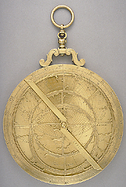 ![]() Astrolabe The inside of the mater is devoid of markings. The throne consists of two raised foliate scrolls with an inset swivel pin. The rete has a complete equatorial circle ; the star pointers are worm-shaped. The names of 50 stars are given, mostly with their magnitudes and corresponding planetary temperaments. The ecliptic is marked with the usual Latin names for the zodiacal signs and their symbols. Each sign is divided into 30? numbered by 10? divided into 5? and subdivided into single degrees. The equator has a 360? scale starting at the first point of Aries anticlockwise, numbered by 10?, divided by 5? and subdivided into single degrees. The four plates are marked on both sides with the circles for the equator (marked 'Aequinoctialis') and the tropics (marked 'Tropicus Cancer' or 'Cancri' and 'Tropicus Capricornus'), azimuths for every 5? (numbered by 5?), almucantars for every 5? (numbered by 5?), the lines for the unequal hours (numbered 1 to 12), markings for the astrological houses in the manner of Regiomontanus (numbered I to XII), the 'Horizon obliqus' and the 'HORIZON RECTUS' and the twilightcurve (marked 'LINAE [sic] AVRORE SIVE CREPVSCOLINE'). The sides are marked and laid out for the following latitudes ('Polus Graduum'): 1a) 35?; 1b) 38?; 2a) 42?; 2b) 45?; 3a) 431/2? ['Gradorum' instead of 'Graduum']; 3b) void except for the three main circles; 4a) 48?; 4b) 52?. The back of the instrument bears several circular scales as follows (from the outside): 1) A concentric 360? altitude scale, marked four times 0? to 90? starting on the east-west line in both directions, numbered by 5?, subdivided to single degrees. 2) A concentric scale with the names of the zodiacal signs marked with the usual Latin names, their symbols and the corresponding planetary houses, each sign divided into 30?, marked by 5? and subdivided to single degrees. 3) An eccentric calendar scale marked with the usual Latin names of the months, divided into the corresponding number of days, every fifth day marked, with subdivisions into single days. The equinoxes correspond to March 21 and September 231/2. The bottom half of the vacant space inside these circles is taken up by a double shadow scale marked 'VMBRA VERSA' and 'VMBRA RECTA' to the base of 12 with divisions into 2 digits (every second numbered) and subdivisions into single digits and 0.2 digits. On the inside of the shadow scale is the signature 'CORNELIO VINCH FIAMENGO DE ANVERSA FECEB{AT} NEAPO{LIS} MDXCVIII'. The space outside the shadow square is filled with a floral design with strapwork and grotesque masques. The top half contains a double horary quadrant for unequal hours, marked I to XII. Inside the midday circle is a wreath. The rule, marked 'INDEX' on one arm, is counterchanged and marked with an irregular scale 65? to 0? to 25?, every 10? numbered, divided to 5? and subdivided to single degrees. There is no alidade. The instrument was presented by A.W. Franks in 1857 and is described in F. A. B. Ward, A Catalogue of European Scientific Instruments in the Department of Medieval and Later Antiquities of the British Museum (London, 1981), p. 118, no. 340. Silke Ackermann |