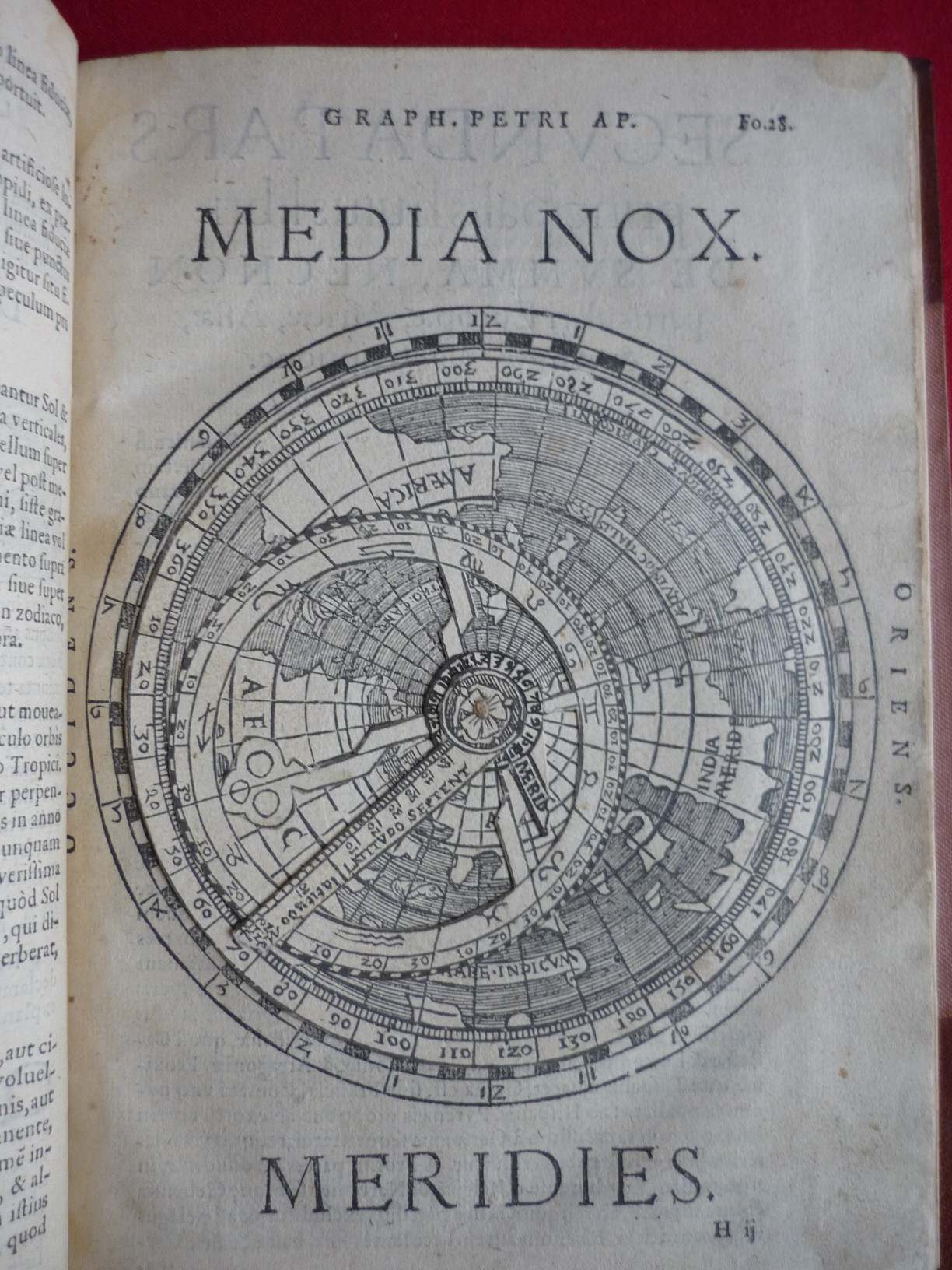 One of the many editions by Gemma Frisius, published from 1529 onwards, of the popular work on cosmography first written by Peter Apian. It contains several paper instruments with moving parts, the one on view being the ‘speculum cosmographicum’, or cosmographical mirror. It fits perfectly within the agenda of cosmography, which emphasised the relationship between the heavens and the earth. Here an ecliptic circle, marking the annual path of the sun, can rotate above a planispheric projection of the earth, to show the relationships between geographical location, local time and date.