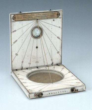 Now based in Nuremberg, having moved from Wittenberg in 1556, Heiden has made an ivory diptych dial – an instrument typical of his adopted city – but one of an individual design, announcing both social and astronomical ambition. It was a gift from the maker to the patrician Thomas Loffelholtz, on his election to the ‘Council of the Seven Lords Elder’ of Nuremberg. Contrasting with the sparseness of the horizontal and vertical string-gnomon dials on the inner surfaces, the outer have brass volvelles with calendars for saints’ days and zodiacal signs, tables for the date of Easter and the solar cycle, and a more sophisticated universal dial.