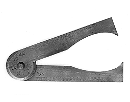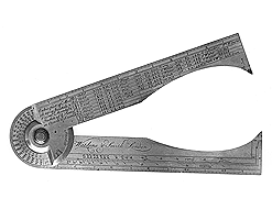 Although gunner's calipers of the continental pattern were known in England through Stone's edition of Bion's book on mathematical instruments (catalogue no. 32), English-made calipers had already settled on a distinctive design. Their two flat blades are hinged so that they slide freely over each other, permitting the steel tips to point either inwards to take the diameters of shot or outwards to measure the bore of a gun. In this example, scales at the hinge give diameters in inches and the corresponding weight of iron shot. The scales for inches of the bore and for the pounder rating of the gun are engraved along the length of one of the limbs. The remaining space on the limbs is occupied with tables of specific weights and quantities of powder for iron and brass guns, as well as a sectoral scale of lines and a series of diagrams representing proportional relationships between different planes and solids.