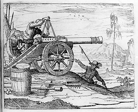 Figure 8: Gunners at work measuring a barrel, with matching ladle in the foreground.