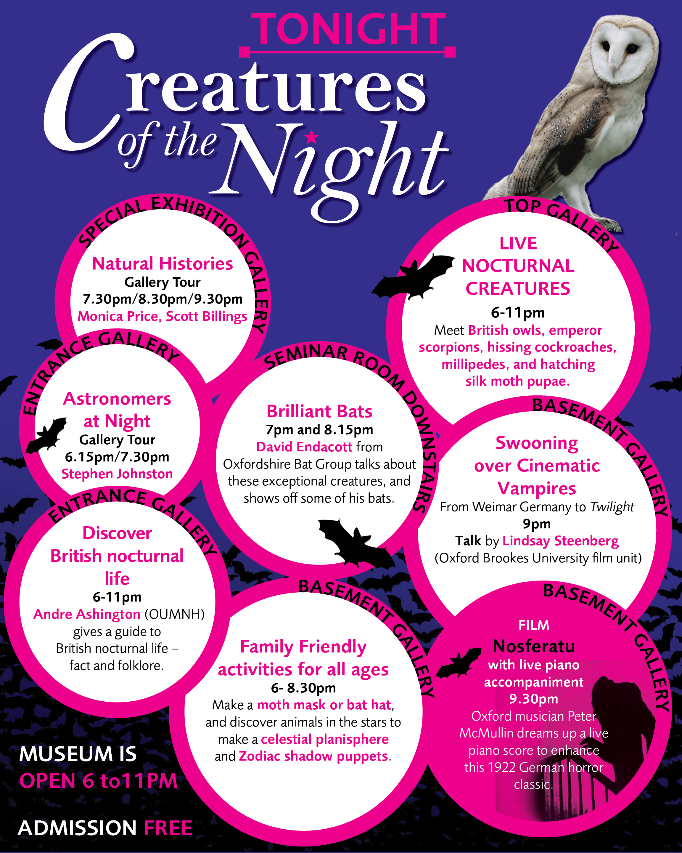 Discover creatures of the night, from flourescent scorpions and wise owls to animals in the stars and scary vampires! Take a tour of the new exhibition 'Natural Histories', meet nocturnal animals, make a star dial and spook yourself with 1922 horror classic 'Nosferatu' with live piano accompaniment. In collaboration with the Oxford University Museum of Natural History.