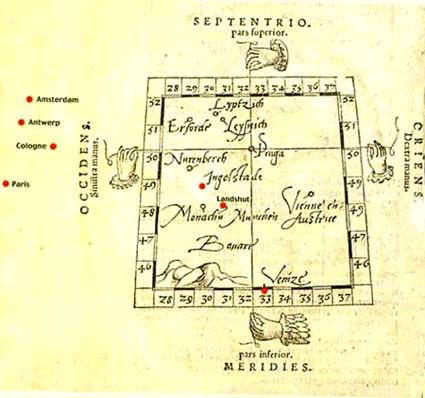 The seven cities in which versions of Cosmographia were produced have been marked in red on this modified Tabularum Ptolomaei (Ptolemaic plat). It has been reproduced from the 1545 Latin edition of the Cosmographia Petri Apiani. Maps of this type were present in all versions of Cosmographia since the 1524 Landshut edition. The added city names have been inserted in a plain typeface. | |||