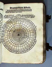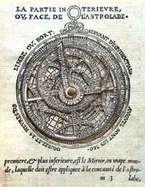 While uncommon, terrestrial astrolabes do appear in other books of the period. In the 1512 edition of Reisch's Margarita philosophia, an astrolabic projection of the Ptolemaic world appears. This one, showing only the geography of Ptolemy, omits entirely the New World, and depicts a broad expanse of ocean where the Americas are located. Another terrestrial astrolabe appears in J. Focard's Paraphrase de L'astrolabe published in Lyons in 1546. This is a smaller, very well-engraved geographical astrolabe. The geographical plate of this astrolabe shows a North American continent attached to South America, but the geography is far less accurate than that found on contemporary maps. | |||||