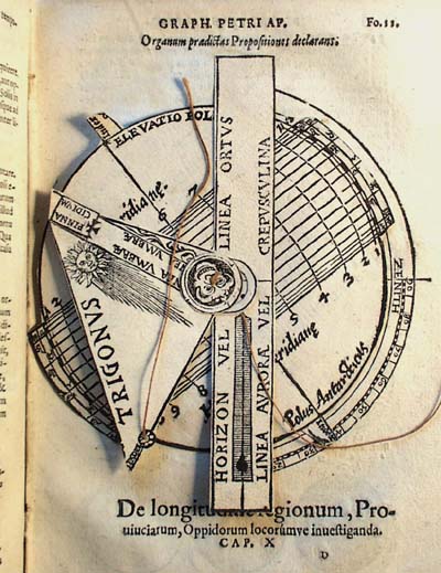 Altitude Sun Dial This full page volvelle is called "Ptolemy's Instrument" by Apianus. The instrument can be used to tell time in any latitude, hence is a universal instrument. It also tells the times of sunrise and sunset and gives the lengths of day and night in any latitude. The back of the Coignet astrolabe is engraved with a similar instrument. |