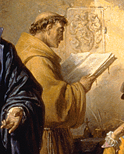 Detail of the monk or friar depicted standing and reading a folio printed volume.