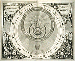 In the Tychonic astronomical system, as illustrated here in a plate from Andreas Cellarus's Harmonia macrocosmica seu atlas universalis et novis, the earth is stationary at the centre of the solar system, with the moon and sun revolving around it but the planets around the sun.