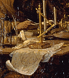 Detail from Ender's painting showing the manuscript sheet that has been left deliberately hanging over the edge of the desk. The manuscript reveals itself as a diagram of planetary aspects and therefore is probably supposed to be signalling the subject of astrology. Also visible is an example of the parallactic instrument; such an instrument was used by Tycho (see Image 29).