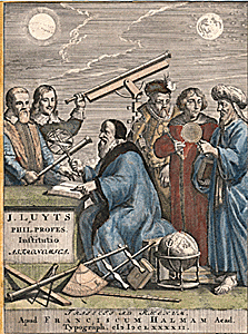 An engraved image of Tycho that appears in a coloured copy of the frontispiece of Joannes Luyts' Astronomica institutio, published in Utrecht in 1692. Luyts has given himself a prominent position (seated) amongst a distinguished group of astronomers: (from left to right) Galileo, Hevelius, Tycho, Copernicus and Ptolemy.