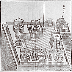 An aerial view of the Imperial Observatory in Beijing, from the Museum's original set of illustrations detailing the form and construction of its instruments. It was printed from woodblocks in China around 1674 on a total of one hundred and five separate sheets of paper approximately 390 x 460mm in size.
