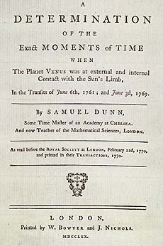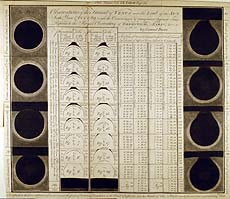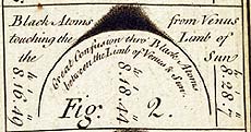 This large engraving was part of a paper in the Royal Societys Philosophical Transactions by the London mathematical teacher, author and publisher Samuel Dunn. Dunn attempted to portray and analyse the black drop. His captions speak of flowing atoms and fibres, and suggest the conceptual difficulties of the irregular and ephemeral phenomenon. |