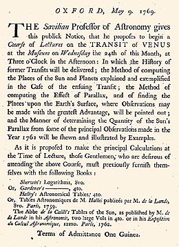 Oxfords leading astronomer was Thomas Hornsby, the Savilian Professor of Astronomy from 1763. He observed the 1769 transit from the Tower of the Bodleian Librarys Old Schools Quadrangle.