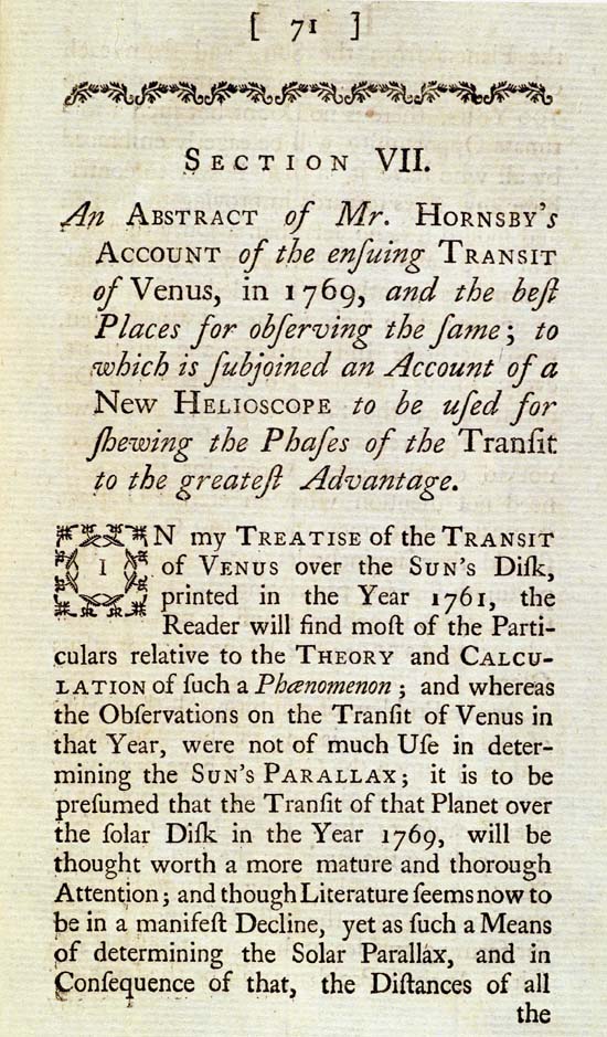 . Section VII of Benjamin Martin, An Appendix to the Description and Use of the Globes (London, 1766), which gives Martins “Abstract of Mr. Hornsbys Account of the ensuing Transit of Venus; with directions subjoined for making a Helioscope to view the Phases to best Advantage.”.