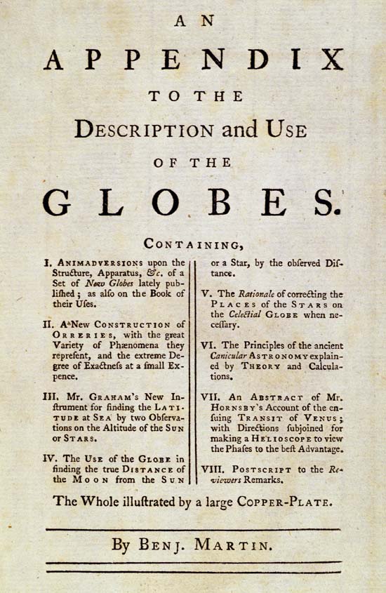 . Title page of Benjamin Martin, An Appendix to the Description and Use of the Globes (London, 1766). Section VII of this polemical and miscellaneous work gives Martins “Abstract of Mr. Hornsbys Account of the ensuing Transit of Venus; with directions subjoined for making a Helioscope to view the Phases to best Advantage.”.