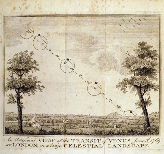Folding plate showing Benjamin Martins “artificial transit”, 1769. The plate faces the title page of Martins