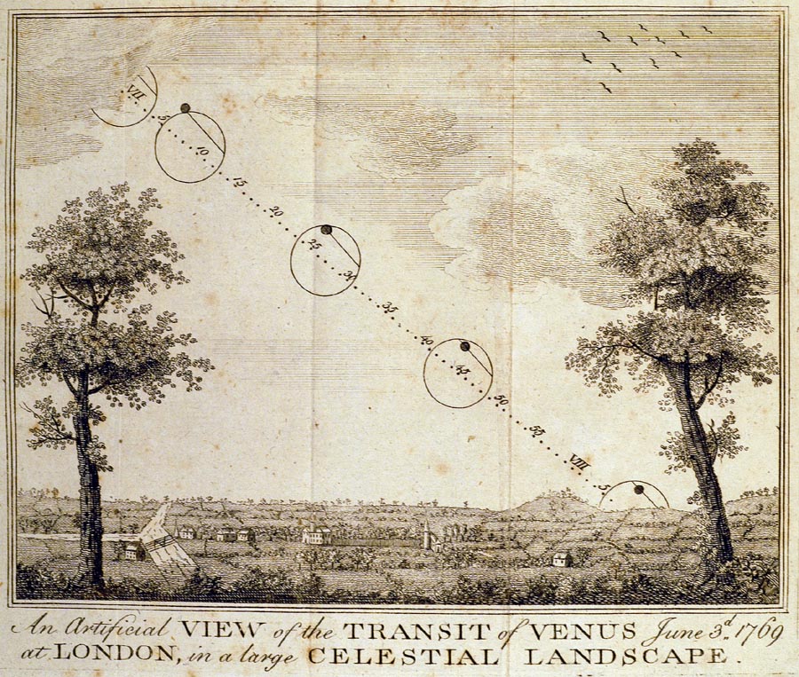 Folding plate showing Benjamin Martins “artificial transit”, 1769. The plate faces the title page of Martins