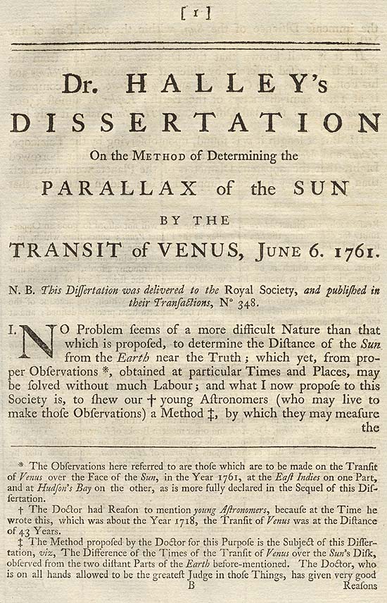 Title page of the translation of Edmund Halleys 1716 paper on the transit of Venus as it appears in Benjamin Martin,