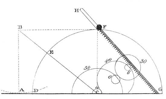 . The Sun-Venus mechanism of Benjamin Martins “artificial transit”, 1769. DG is the diameter of the Sun; F is Venus; and FG a toothed rack moved by a gear train. The numbers represent the teeth on the series of pinions and wheels in the train. Detail from Benjamin Martin, Institutions of Astronomical Calculations (London, 1773).