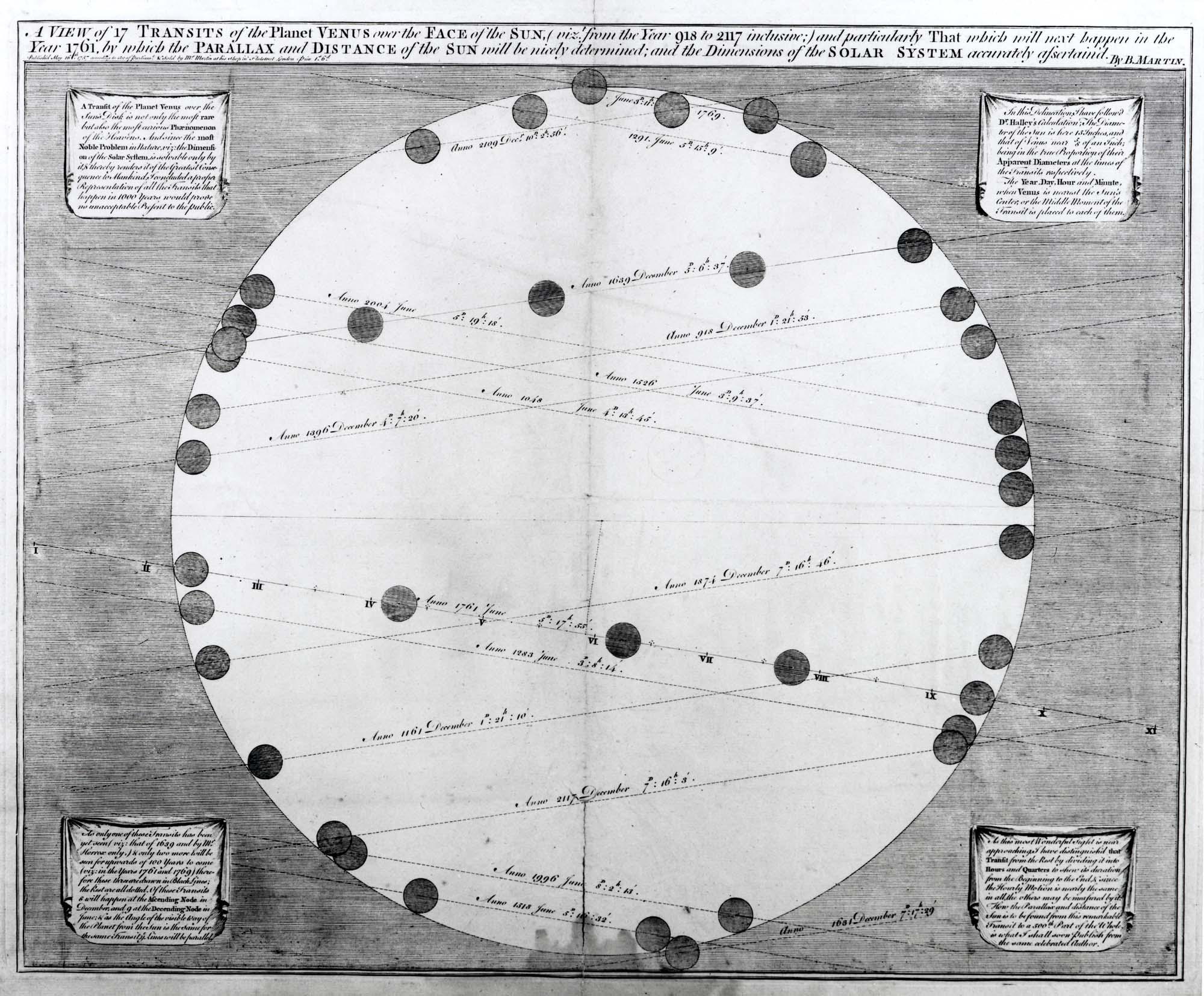 . Benjamin Martins 1757 print showing the paths of 17 Transits of Venus from 918 to 2117. Special attention is given to the transit of 1639 - the only one previously observed - and to the forthcoming transit of 1761. The small print under the title reads “Published May 16th 1757 according to Act of Parliament & Sold by Mr Martin at his Shop in Fleet Street London. Price 1s 6d”. This is a rare survival: only one other copy of this print has been reported. Update 26/08/2008: Rob van Gent reports a third example of this print at the University Library Utrecht, Map Room, Collection Moll, Mappae Astronomicae 32 [20].