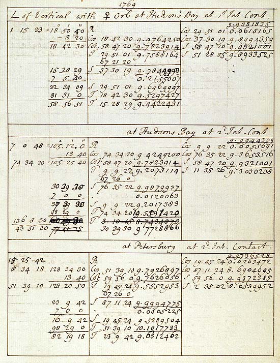Radcliffe MS 7, an astronomical manuscript by Professor Thomas Hornsby. Hornsby is here reducing the two observations of internal contact made in 1769 at Hudsons Bay, as well as that of second internal contact at St Petersburg.