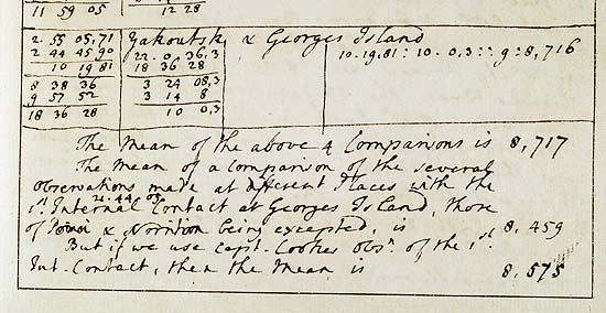 . Radcliffe MS 7, an astronomical manuscript by Professor Thomas Hornsby. Here Hornsby is attempting the difficult task of settling on a value for the solar parallax. Different sets of observations give different mean values, and he judges that certain observations of the 1769 transit should be excluded from the calculations.