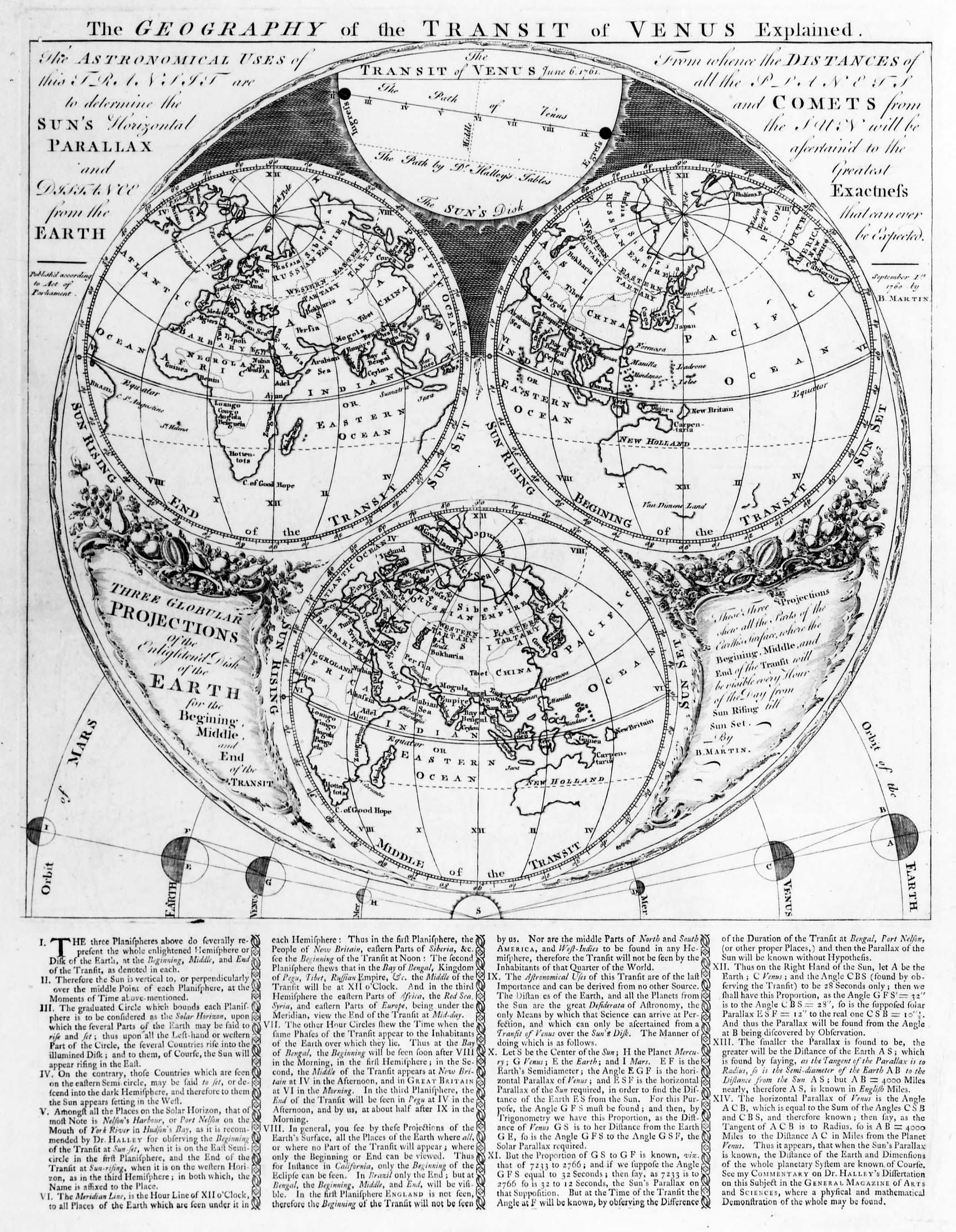 . Benjamin Martins print of the geography of the transit of Venus, published on 1 September 1760. Martin explains the visibility of the transit of 1761 by giving three views of the earth, showing the hemisphere facing the sun at the beginning, middle and end of the transit. This is the only known surviving copy of his print.