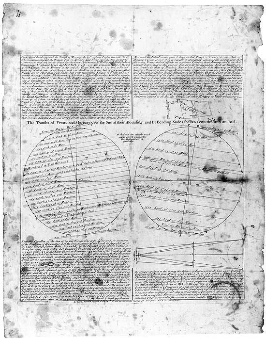 . William Whistons print of “The Transits of Venus and Mercury over the Sun at their Ascending and Descending Nodes for Two Centuries and an half”, dated 22 october 1723. Despite Edmond Halleys emphasis on Venus, Whiston considered that Mercury was as likely to provide a reliable value for the Suns parallax. The print is signed “London. Printed for and Sold by I. Senex at the Globe against St Dunstans Church in Fleet Street”.